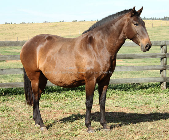 Bay mare of strong structure, sired by the late Tufão Interagro, golden buckskin stallion of excellent temperament and awarded in Dressage. Tufão produced an offspring of great character and functionality. Cyclope´s dam is the bay Relíquia, bred by Núncio Stud farm in Portugal, she was approved with 73 points and is the paternal sister of Rapsódia (JNU). One of Cyclope II’s daughters, Lucila Interagro by Zíngaro Interagro, is driven and in training to be part of Interagro’s new four in-hand.