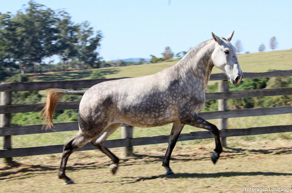 She is the only daughter of Imoral Interagro, grey mare revised with 73,50 points and prematurely deceased. Imoral was a daughter of Cartomante Interagro, a very typical, feminine and good mover broodmare, sired by Quixote Interagro, a stallion approved with 79 points and paternal brother of Ofensor (MV). Cartomante´s dam is Malagueta do Mirante, a daughter of Emir II (MV) and the extraordinary Cigana III (MLC), Interagro’s most important womb. Imoral´s sire, Destinado Interagro, was a horse with excellent gaits and was approved as a stallion with 71 points. He was the son of Morgada (MAC), imported from the famous Coimbra Stud Farm (MAC), a daughter of Zebra (MAC) with Distinto (MAC), Grand Champion in Lisbon, producer of great and excellent progeny in Brazil and Portugal. Her father, the remarkable Noblíssimo Interagro, has 7/8 Veiga and 1/8 Andrade blood, with ¼ inherited from his grandfather, the fabulous Xique-Xique (CI). Destinado produced excellent progeny bearing the great qualities of his rare and much sought after lineage, among them Locrus Interagro, Lombardo Interagro and Lord Interagro, all awarded in Classic Dressage.